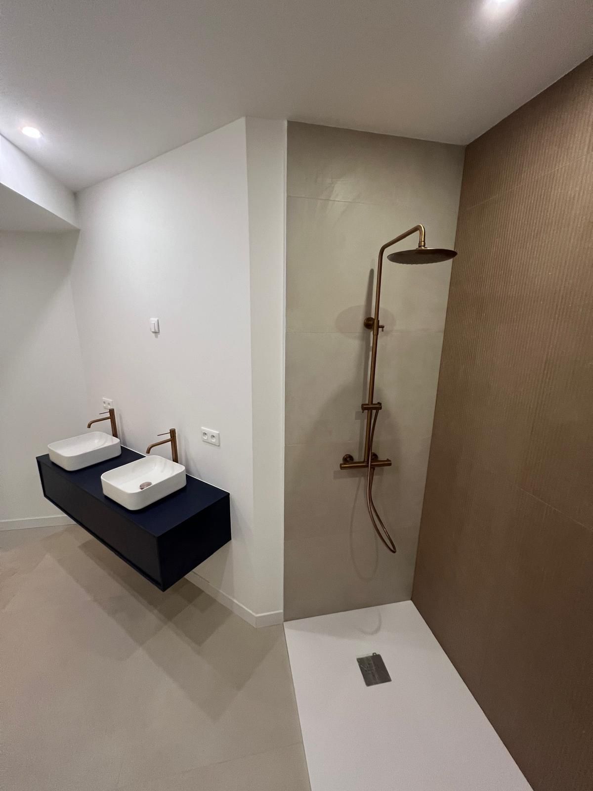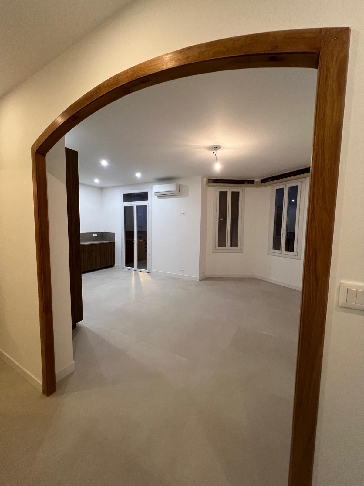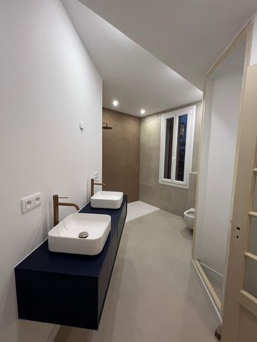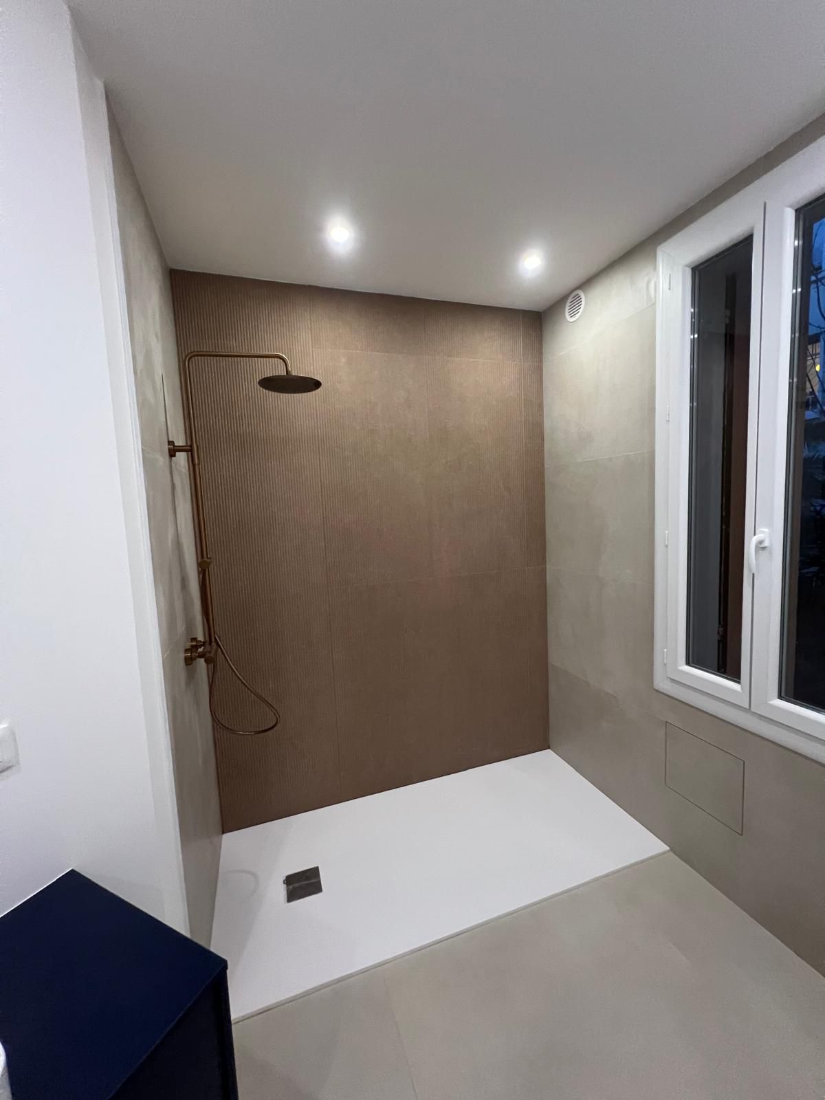 Pour cette réalisation à Carqueiranne, le choix s’est porté sur un 100x100 effet béton ciré beige signé Ceramic Outlet Store.